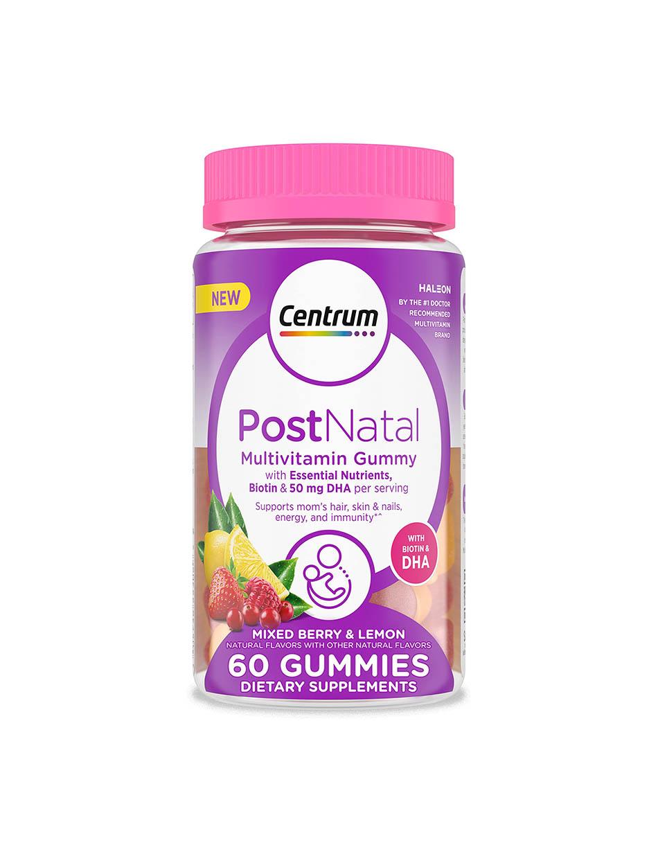 Les bonbons postnatals Centrum contiennent du DHA ainsi que des vitamines B pour aider à soutenir l'énergie et de la vitamine C pour le soutien immunitaire (1). Ces bonbons multivitaminés contiennent également de la biotine pour soutenir la santé des cheveux, de la peau et des ongles (1).